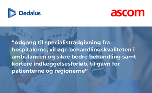 Dedalus Northern Europe, som er en del af Dedalus Group og Europas førende leverandør af softwareløsninger inden for sundhed og diagnostik samt Ascom, Nordens førende leverandør af kommunikations- og alarm løsninger til hospitaler, indgår forpligtende udviklingssamarbejde med målet om at øge behandlingskvaliteten i ambulancen gennem adgang til specialist rådgivning fra det modtagende hospital, samt at øge mulighed for flere tidlige indsatser i akutmodtagelsen, baseret på data fra ambulancen.