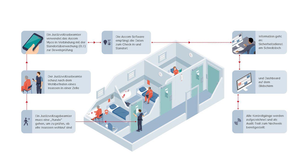 Ascom bietet eine umfassende Lösung aus einer Hand für den Schutz von Sicherheits- und Gefängnispersonal inklusive Nachverfolgung der Aktivitäten für den Nachweis, dass die erforderlichen Kontrollen durchgeführt wurden. Die Lösung wird auf mobilen Geräten mit integrierten Sicherheitsfunktionen für das Personal, wie z. B. Paniktasten zum Auslösen eines Alarms, Echtzeit-Ortungstechnologien, Alarm-Dashboards, Vorfallkartierung und Arbeitsabläufen mobiler Einsatzteams bereitgestellt. Zudem kann das Personal an jedem erforderlichen Ort einchecken und Nachweise dazu erbringen, dass die erforderlichen Aufgaben erledigt wurden.
