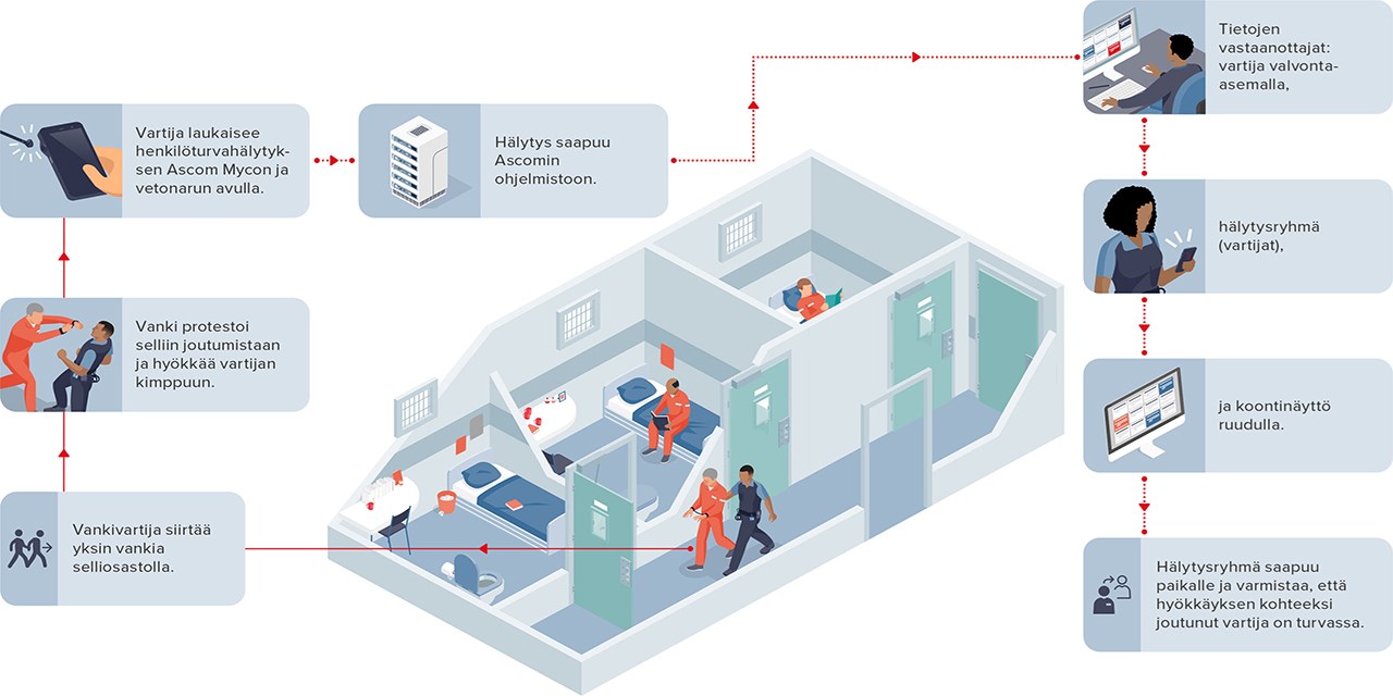 Ascom tarjoaa kokonaisratkaisun hälytysten lähettämiseen uhkaavissa tilanteissa. Ascomin mobiililaitteissa on sisäänrakennetut turvallisuusominaisuudet, kuten hätäpainikkeet ja reaaliaikaiset paikannustekniikat. Hälytysten koontinäytöt, tapahtumien kartoitus ja liikkuvien pelastustiimien työnkulut auttavat varmistamaan, että tiimit pystyvät reagoimaan uhkaaviin tilanteisiin mahdollisimman nopeasti.