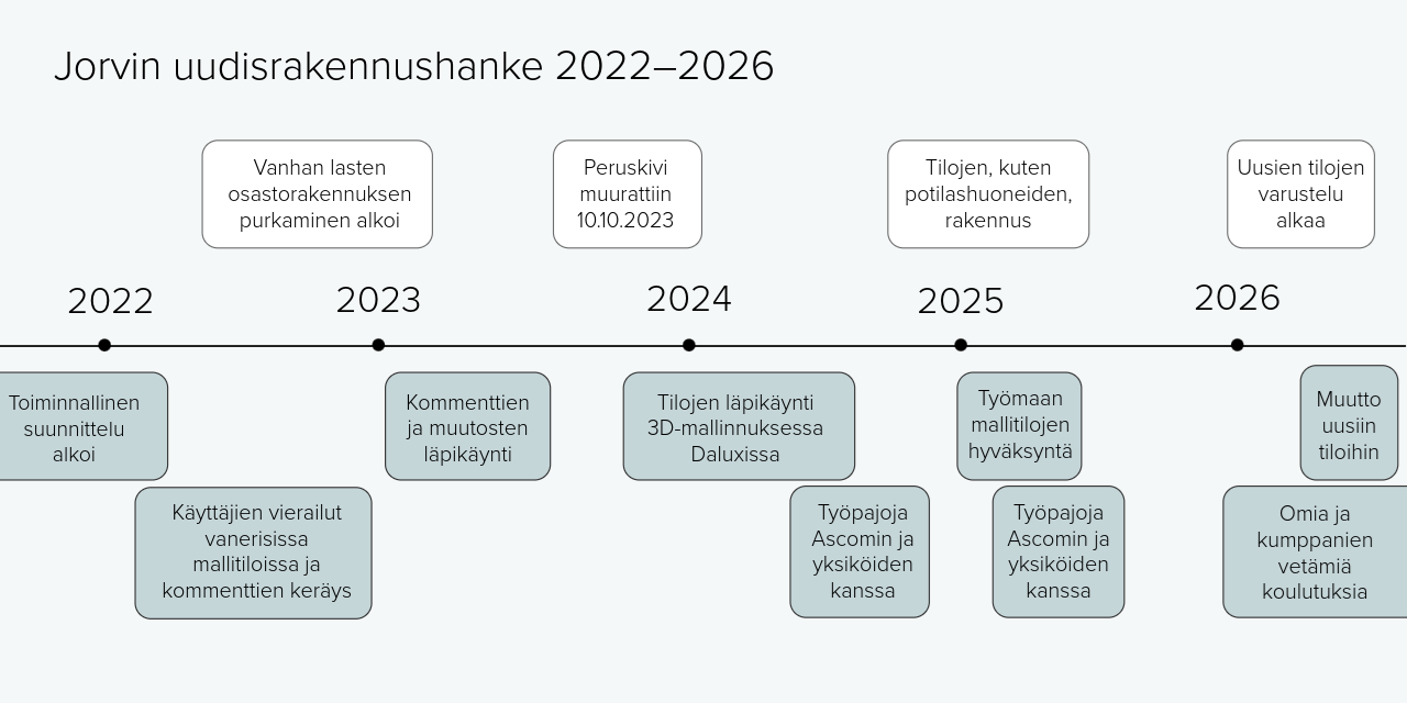 Jorvin uudisrakennushankkeessa myös suunnitteluvaiheeseen on investoitu mittavasti. Työnantajan ja satojen käyttäjien sitoutuminen on pitänyt hankkeen aikataulussa, vaikka matkalle on osunut pandemia, työtaisteluja sekä käyttäjien eriäviäkin toiveita.