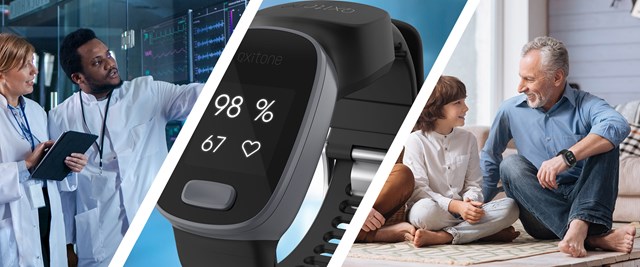 Oxitone ha sviluppato una soluzione di monitoraggio remoto continuo per soddisfare l'esigenza di cure continue per pazienti con patologie croniche e complesse gravi. Il fulcro della soluzione è costituito da un monitor medicale da polso, estremamente accurato, con certificazione CE e approvato dalla FDA. Oxitone 1000M raccoglie e analizza continuamente diversi parametri fisiologici, come la saturazione dell'ossigeno nel sangue, la frequenza e la variabilità cardiaca, la temperatura cutanea, l'attività, i disturbi del sonno, la frequenza respiratoria e i loro derivati3. Ciò consente ai medici di prendere decisioni terapeutiche in tempo reale.