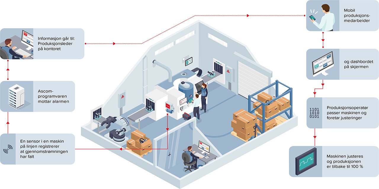 Ascoms IoT- og sensorintegrasjonsløsninger gjør det mulig å samle inn og sende riktig informasjon til de rette personene til rett tid – noe som gjør produksjonen mer effektiv og kostnadsbesparende samt hjelper deg med å identifisere ytterligere gevinstmuligheter.
