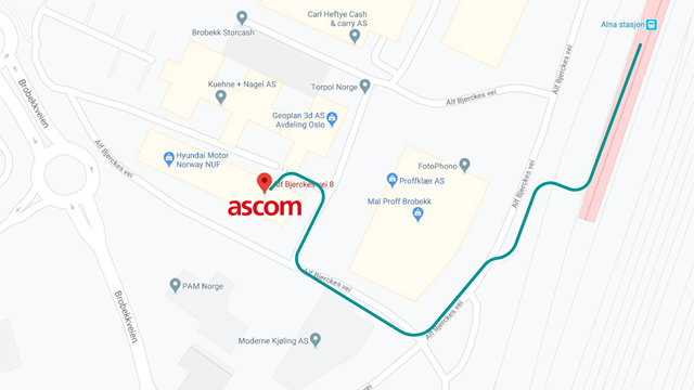 Kursene finner sted i våre lokaler i Alf Bjerckes vei 8, Oslo. Vi anbefaler å benytte tog som fremkomstmiddel fra Oslo S mot Lillestrøm. Reisetiden er 7 minutter, og det er avganger hvert kvarter morgen og ettermiddag. Følg grønn stripe i anvisningen på bildet til høyre fra Alna togstasjon til våre lokaler.