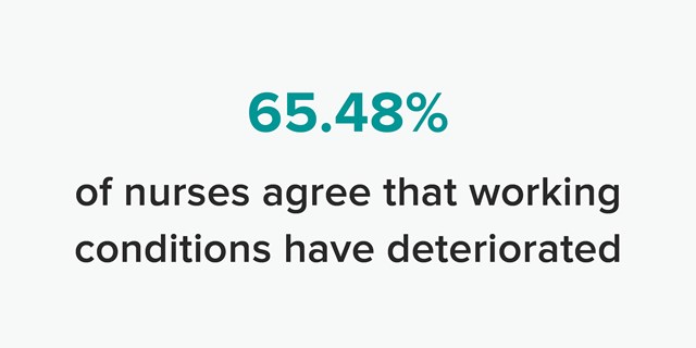 A majority (65.48 percent) of nurses say industry and workplace factors, such as more unpredictability, increased concerns for safety and wellbeing as well as legal liability, and potential criminal prosecution for mistakes, have been exacerbated a lot or a great deal in past two years.