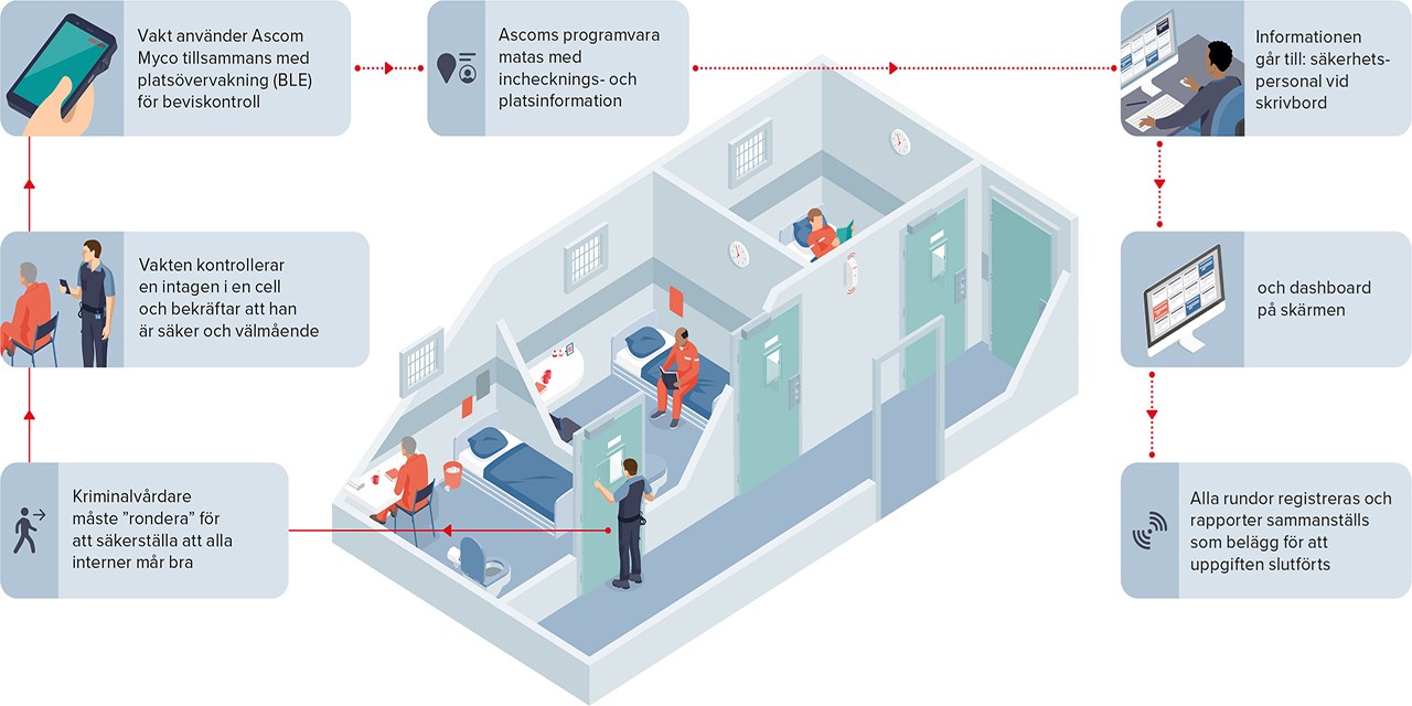 Ascom erbjuder en komplett lösning för vakt- eller anstaltspersonal med möjlighet att spåra aktiviteter för att visa att nödvändiga kontroller har utförts. Lösningen är baserad på mobila enheter med inbyggda personsäkerhetsfunktioner som panikknapp för att slå larm, realtidslokalisering, larmpaneler, incidentkartläggning och koordinering av mobila insatser. Samt möjlighet att rapportera närvaro på förutbestämda platser och dokumentera att obligatoriska uppgifter har utförts.