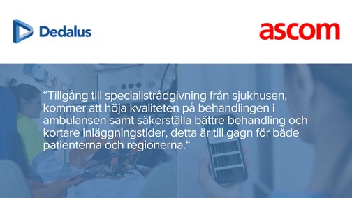 Dedalus Northern Europe, som ingår i Dedalus-koncernen och Europas ledande leverantör av mjukvarulösningar inom hälsa och diagnostik, samt Ascom, Nordens ledande leverantör av kommunikations- och larmlösningar för sjukhus, ingår ett bindande utvecklingssamarbete med syfte att öka kvaliteten på behandlingen i ambulansen genom tillgång till specialistrådgivning från mottagande sjukhus, samt öka möjligheten till fler tidiga insatser på akutmottagningen, baserat på data från ambulansen. Ett bättre beslutsunderlag över den prehospitala insatsen säkerställer bättre behandling och kortare inläggningstider vilket är till gagn för både patienten och regionerna.